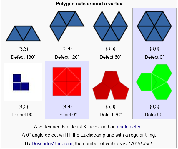 - 2. At each vertex of the solid, the total, among the adjacent faces, of the angles between their respective adjacent sides must be less than 360°. The amount less than 360° is called an angle defect.