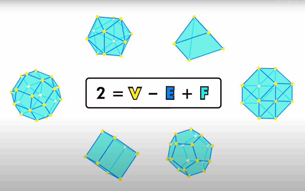 NB – Long before Euler, in 1537, Francesco Maurolico stated the same formula for the five Platonic solids (see Friedman). Another version of the formula dates over 100 years earlier than Euler, to Descartes in 1630. Descartes gives a discrete form of the Gauss-Bonnet theorem, stating that the sum of the face angles of a polyhedron is , from which he infers that the number of plane angles is 2F + 2V – 4.
